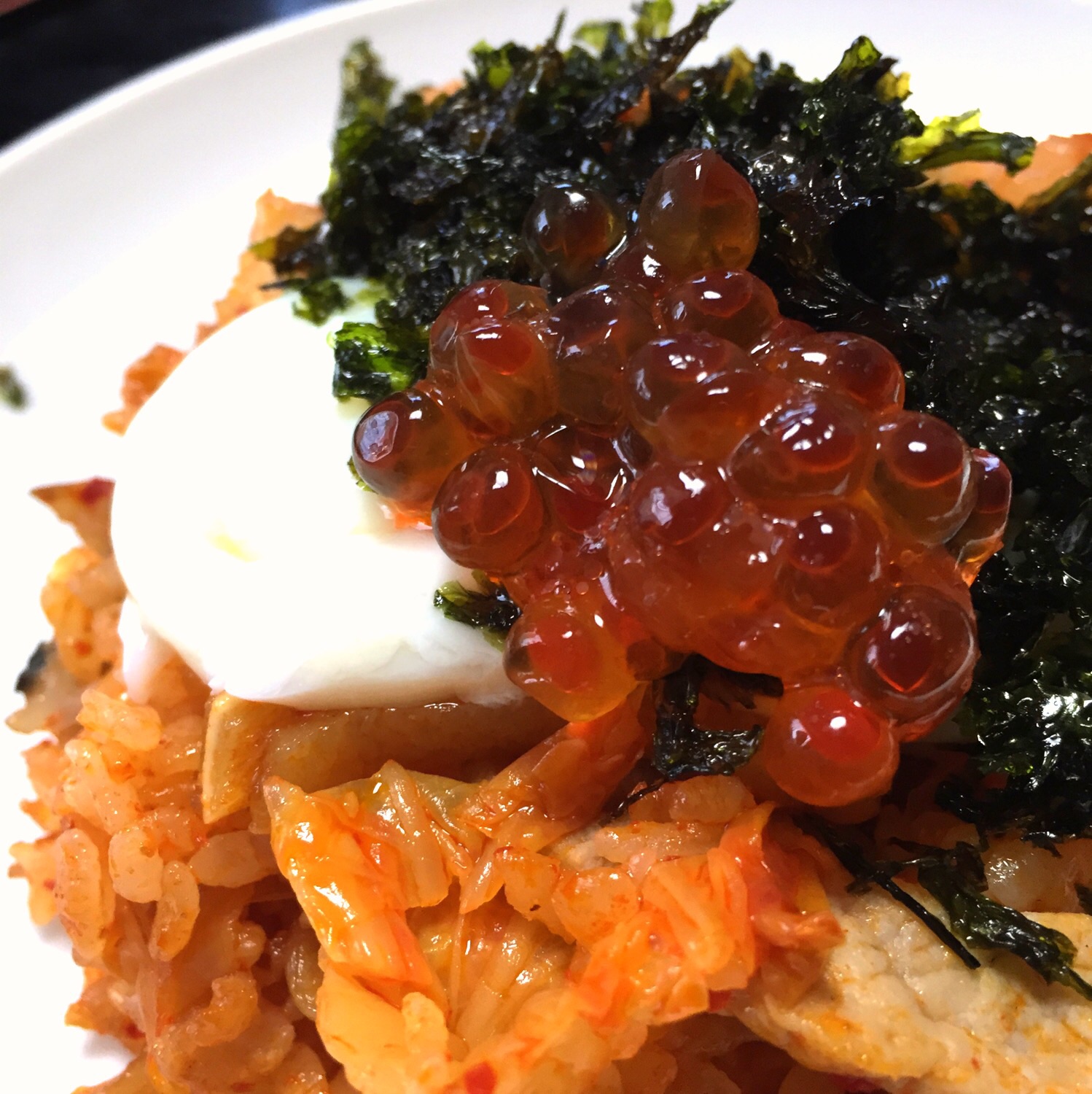 温泉たまごを載せて、韓国ぱらぱらのりをのせて。。。いくらの醤油づけ。。?!(≧∀≦)