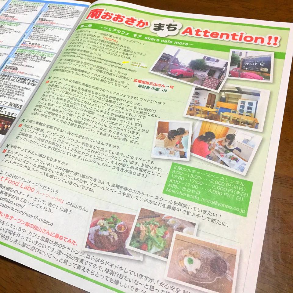 フリーペーパー お仕事クック の、南大阪まちattentionコーナーに、現在毎週金曜日お借りしているシェアカフェmoreさんと、ハートフードラボ が載っています♪
